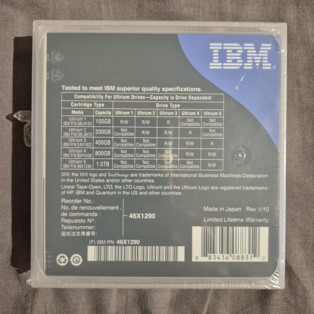 Ez egy IBM TotalStorage LTO Ultrium 5 adatkazetta, amely 1,5 TB natív és 3,0 TB tömörített adat tárolására alkalmas. A termék eredeti, bontatlan csomagolásban látható, és professzionális adatmentési, archiválási célokra használható. A kazetta kompatibilis az LTO Ultrium 5 meghajtókkal, és a hátoldalon részletes információk találhatók a különböző LTO generációk kapacitásairól és kompatibilitásáról. A termék IBM márkájú, Japánban készült, és élettartam garanciával rendelkezik. A csomagolás átlátszó műanyagból készült, a kazetta mérete szabványos LTO formátumú.