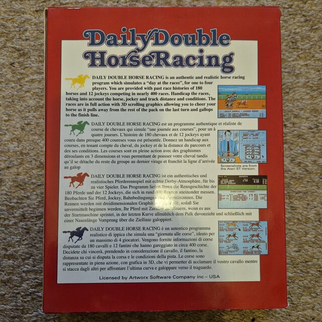 A Daily Double Horse Racing egy klasszikus lóversenyzős videójáték Amiga platformra, amely eredeti dobozában látható. A doboz elején két versenyző ló és zsoké látható, míg a hátoldalon részletes leírás található a játékról több nyelven, valamint néhány képernyőkép is megjelenik. A játék lehetőséget ad akár négy játékos számára, hogy részt vegyenek virtuális lóversenyeken, fogadjanak és menedzseljék a versenyeket. A doboz jó állapotúnak tűnik, és gyűjtők számára is értékes lehet. A termék főként kartonból készült, és a klasszikus Amiga korszakot idézi.
