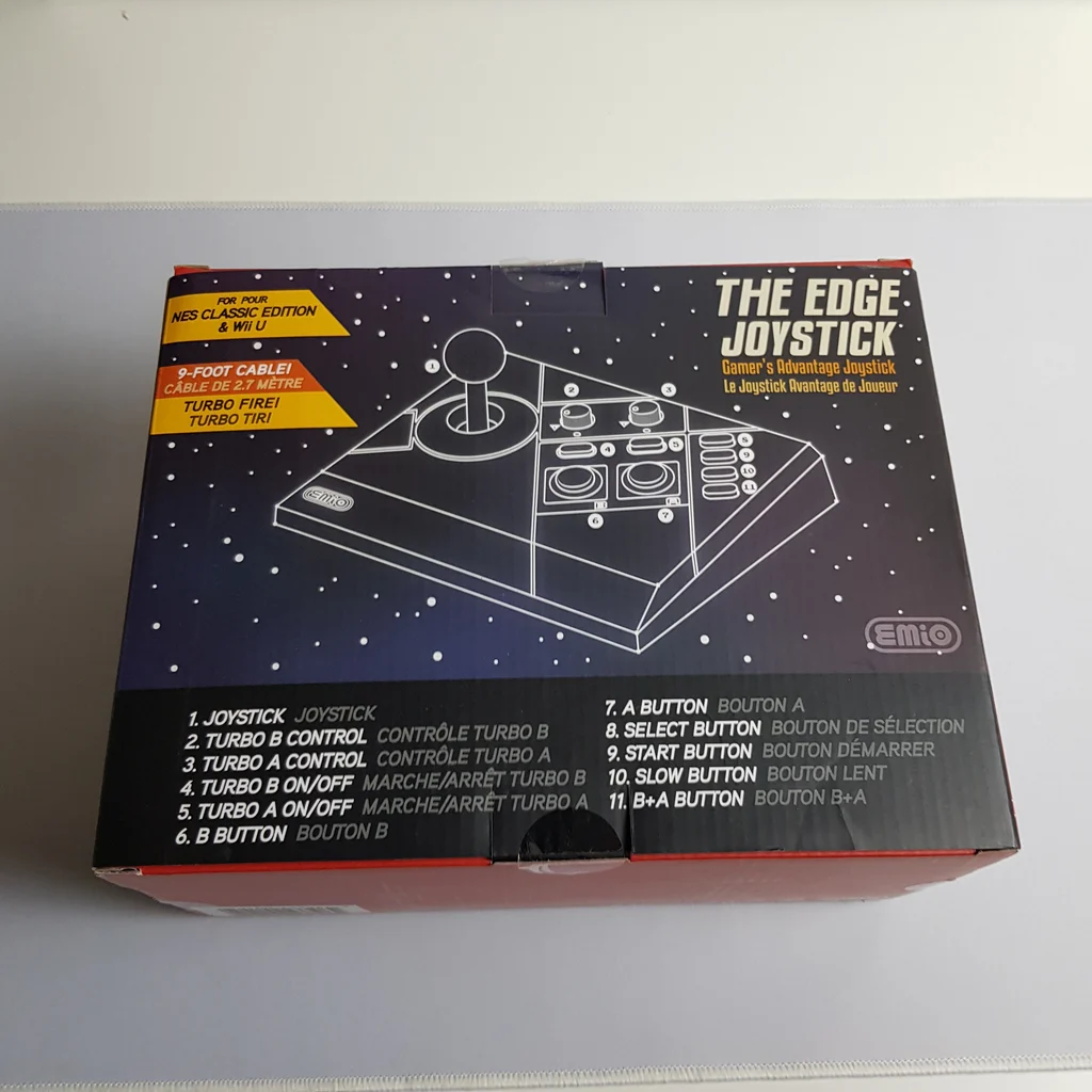 Ez a termék egy Emio márkájú The Edge Joystick, amelyet kifejezetten NES Classic Edition és Wii U konzolokhoz terveztek. A doboz alapján a joystick 2,7 méteres (9 láb) kábellel rendelkezik, valamint több gombbal, köztük turbó funkcióval ellátott vezérlőkkel. A csomag tartalmaz egy bónusz Cheat Code könyvet is. A joystick klasszikus, retro stílusú kialakítású, fehér és fekete színű, piros gombokkal. A termék főként műanyagból készült, és játékvezérlőként használható régi és újabb Nintendo konzolokhoz.