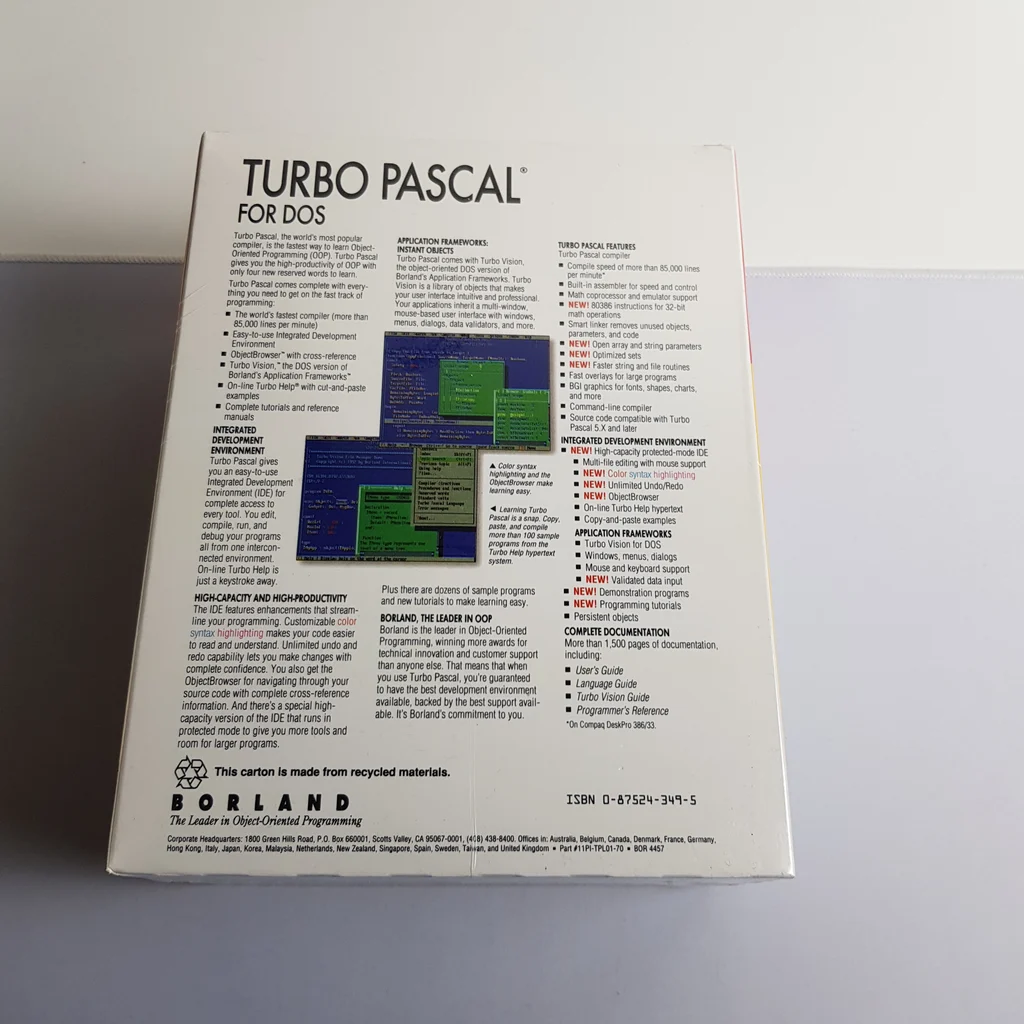 Ez a termék a Turbo Pascal 7.0 for DOS dobozos szoftver, amelyet a Borland adott ki. A csomagolás klasszikus, fehér és sárga színű kartondoboz, amelyen jól látható a Turbo Pascal logó, a 7.0 verziószám, valamint a DOS platform megjelölése. A doboz elején kiemelik, hogy a szoftver tartalmazza az ObjectBrowser funkciót, és több mint kétmillió példányban kelt el. A hátoldalon részletes rendszerkövetelmények, funkciók és képernyőképek találhatók. A termék fóliázott, bontatlan állapotban van, így gyűjtői darabnak is számít. A szoftver elsősorban fejlesztőknek, programozóknak készült, akik DOS környezetben szeretnének objektum-orientált programozást tanulni vagy alkalmazni.