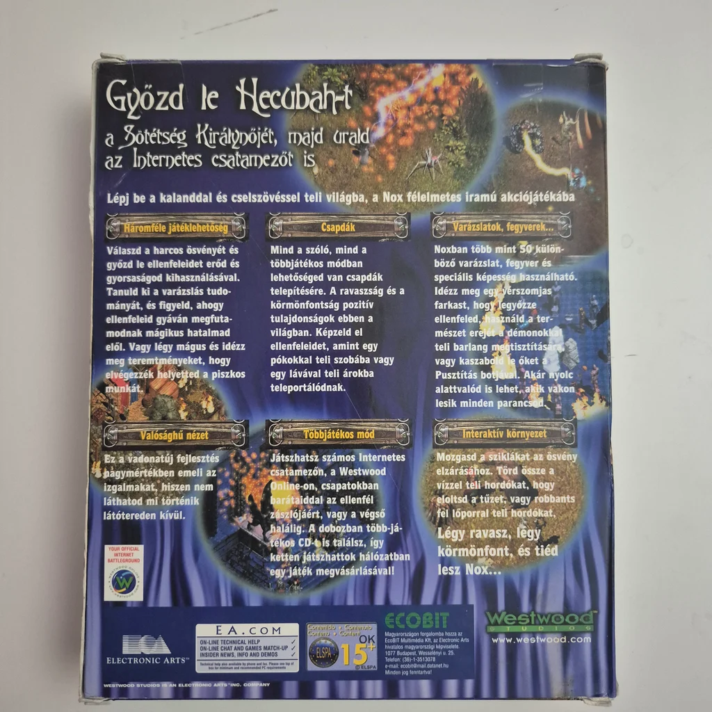 Ez a Nox című klasszikus akció-szerepjáték eredeti, dobozos PC-s változata, amelyhez magyar nyelvű kézikönyv is tartozik. A játékot a Westwood fejlesztette, és a dobozban többjátékos CD is található. A borítón látványos fantasy grafika látható, amely a játék világát idézi meg. A hátoldalon részletes leírás olvasható a játékmenetről, a főbb jellemzőkről és a többjátékos lehetőségekről. A termék 15 éven felülieknek ajánlott, és a doboz jó állapotban van. Gyűjtők számára különösen értékes lehet, mivel magyar nyelvű kiadásról van szó.