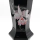 image1_alt | Fekete váza, amelyen rózsaszín és fehér kézzel festett virágminta látható. |