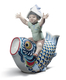 Fedezze fel eleganciával és játékossággal teli porcelánszobrunkat, amely egy vidám gyermeket ábrázol egy stilizált hal hátán, ideális bármely enteriőrhöz.