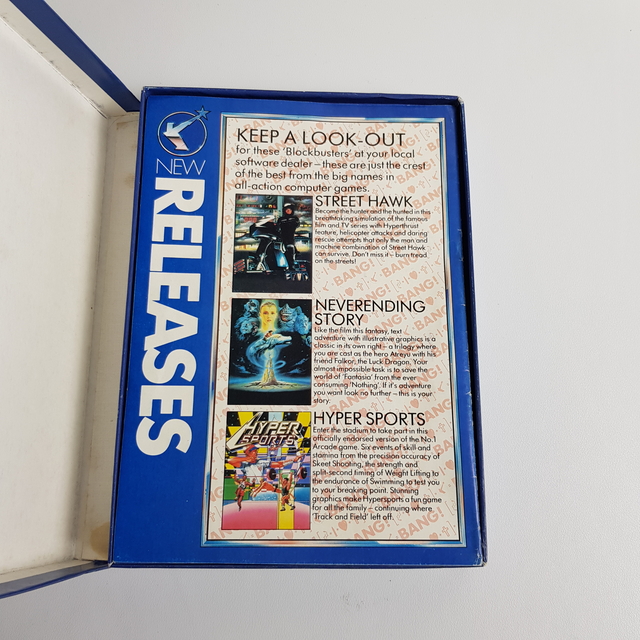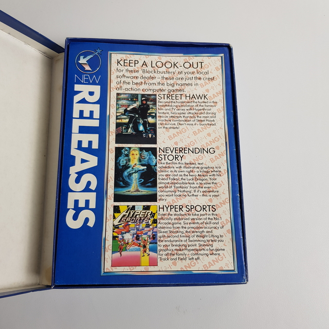 Ez a termék egy 'Frankie Goes to Hollywood' nevű számítógépes játék, amely a híres brit pop együttes, a Frankie Goes to Hollywood nevét viseli. Az elülső borítón az együttes tagjai láthatók, egy futurisztikus dizájn kíséretében, ami utal az 1980-as években népszerű sci-fi stílusra. A játék a Commodore 64 platformra készült és kazettás formátumban érhető el. A doboz hátulja részletes leírást nyújt a játékmenetről, és a doboz belső része további játékok reklámjait tartalmazza, mint például a 'Street Hawk' és a 'The Neverending Story'. A kazettákon az 'Ocean' logó is szerepel, amely a kiadó cég neve. A színek főként kékek és narancssárgák, ami a játék retro esztétikáját tükrözi. A játék célja, hogy különböző kihívásokat és rejtvényeket oldjon meg a játékos, miközben a zenekar slágerének, a 'Relax' különleges élő felvétele is elérhető benne.