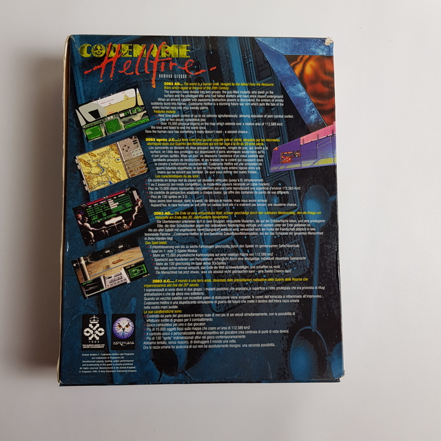 A termék egy dobozos számítógépes játék, amely az Amiga platformra készült. A doboz tartalmaz több floppy lemezt, amelyeken a 'Codename: Hellfire' nevű játék található. Az előlap egy grafikát ábrázol, amely sci-fi stílusú, robotos-hadihajós témákra utal. A játékról számos információ található a doboz hátoldalán, amelyek segítenek megérteni a játékmenetet és a játék jellemzőit. A játék doboza újrahasznosított, biolebomló anyagból készült, amit a doboz belsejében egy felirat is hangsúlyoz. Ez a termék kifejezetten számítógépes játékok rajongói számára készült, akik értékelik a retro, vintage játékokat, különösen az Amiga platformon.