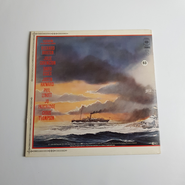A képen Jeff Wayne 1978-as zenei albuma, a "The War of the Worlds" látható, amely egy konceptalbum H.G. Wells híres sci-fi történetén alapul. A borítón egy ikonikus jelenet látható, ahol az idegen harci gépek megtámadják a hajókat a tengeren. A művészi illusztrációk magával ragadóak, és jól visszaadják a történet drámai hangulatát. Az album hátoldalán a közreműködő művészek nevei olvashatók, köztük Richard Burton és Phil Lynott. Az album híresek epikus zenei kompozícióiról és a narratíva egyedülálló kombinációjáról, amely vizuális és zenei élményt is nyújt. Az album fedele papírból készült, és klasszikus bakelit lemez formátumban áll rendelkezésre. A borítón látható képek színei élénkek, a feliratok vörösek.