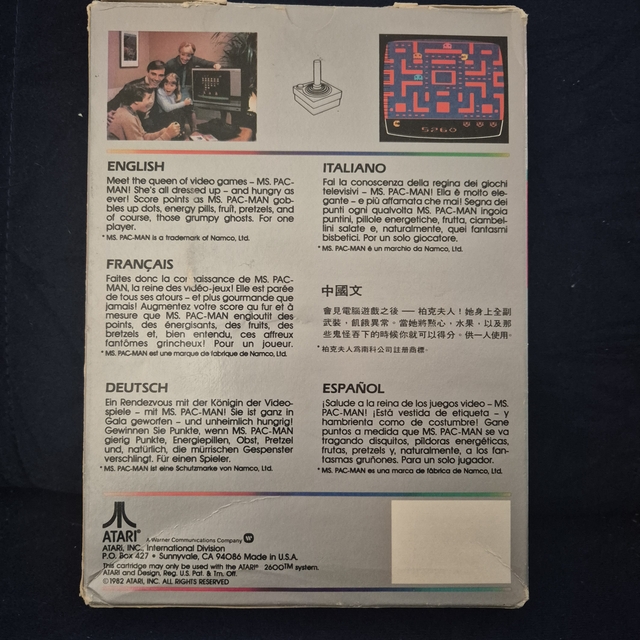 Ez egy klasszikus Atari 2600 játékkazetta, amely a híres Ms. Pac-Man játékot tartalmazza. A dobozon a játék ikonikus karakterei, köztük Ms. Pac-Man és a színes szellemek láthatók. Az angol, francia, német, olasz, spanyol és kínai nyelvű leírások találhatók a doboz hátoldalán, amelyek útmutatást nyújtanak a játék működéséhez. A doboz felső részén az Atari logója és a konzol megnevezése látható. A termék a klasszikus videojáték-gyűjtők számára értékes darab lehet.