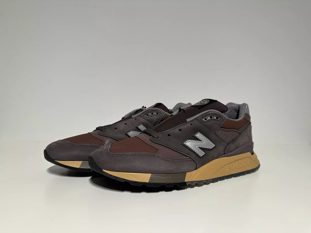 Eladó egy pár New Balance cipő, szürke és barna színben, magas minőségű anyagokból és kényelmes ABZORB talppal. Tökéletes választás, ha stílusos és kényelmes lábbelit keresel.