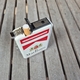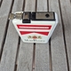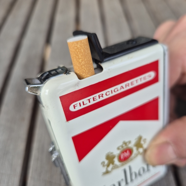 Ez a kép egy Marlboro márkájú cigarettáskészletet ábrázol, amely öngyújtóként is funkcionál. A készlet egy elegáns fémházzal rendelkezik, amely a klasszikus Marlboro cigarettadoboz dizájnjára emlékeztető piros-fehér színben pompázik. A doboz tetején lévő mechanizmus egy cigarettát emel ki, ami egyszerű és kényelmes használatot biztosít. A terméket minőségi anyagokból, fém és műanyag kombinációjából tervezték, amely tartós használatot garantál. Ideális azok számára, akik stílusos módját keresik a cigaretta tárolásának és gyújtásának. A cigarettáskészlet alján egy egyedi azonosító szám található, ami gyűjtők számára is vonzóvá teszi.
