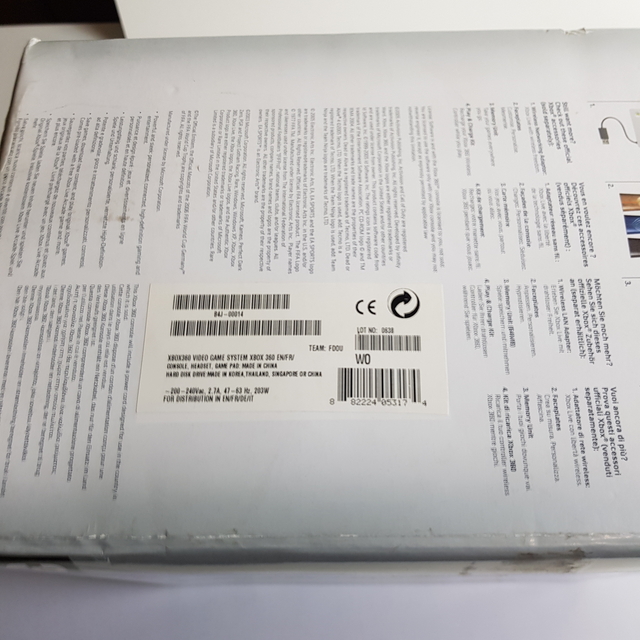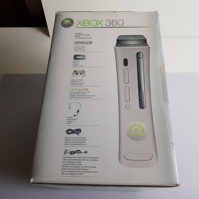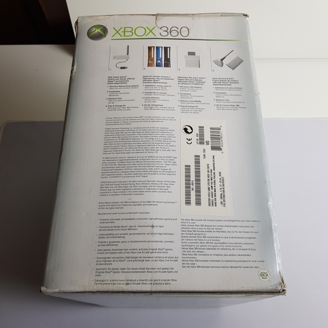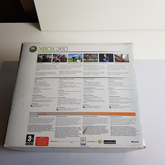 Ez egy Xbox 360 konzol doboza, amely a Microsoft híres játékkonzolját tartalmazza. A doboz elején a zöld és szürke színvilág dominál, és az Xbox 360 logó látható. Az oldalsó részen a konzol és a kapcsolódó kiegészítők, mint például a kontroller és csatlakozók vannak illusztrálva. A doboz hátoldalán angol nyelvű leírás és specifikációk találhatók. A csomag tartalmáról is van kép, amely az utasításokhoz, a játékokhoz és az Xbox Live szolgáltatáshoz kapcsolódik. A termék karton anyagból készült, és általában 3 éves kortól ajánlott a használata.