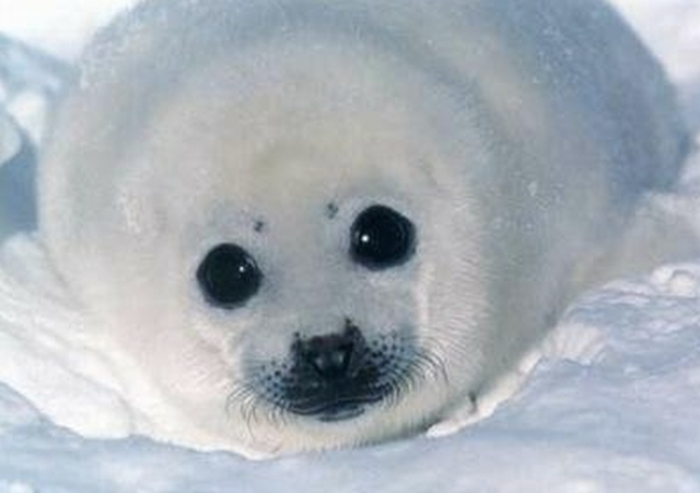 Ez a kép egy aranyos, fiatal fókát mutat, amely hófehér bundájával és nagy, sötét szemeivel békésen pihen. Ideális természeti jelenet a fókabébi szépségéről és védelméről.