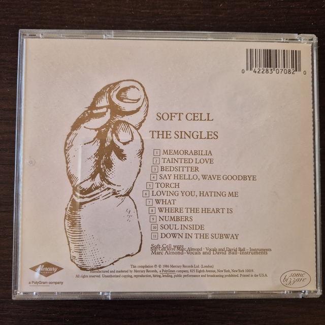 Ez a Soft Cell együttes 'The Singles' című CD-je, amely a legjobb dalaikat tartalmazza, többek között a híres 'Tainted Love' számot. A borító futurisztikus és misztikus dizájnt mutat, amelyen egy szem, lépcsők és különböző szimbólumok láthatók. A CD hátoldalán a számok listája szerepel, többek között a 'Memorabilia', 'Say Hello, Wave Goodbye', és a 'Loving You, Hating Me'. A CD tokja műanyagból készült, és tartalmazza az összes fontos információt az albumról és az együttesről. Klasszikus popzenei válogatás, amely különösen a nyolcvanas évek zenéi iránt érdeklődők számára lehet vonzó.