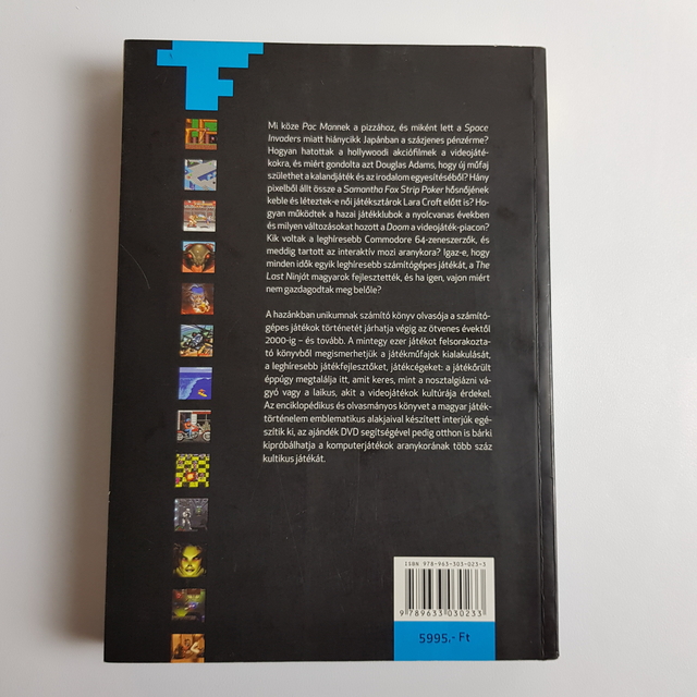 A képen Beregi Tamás 'Pixelhősök' című könyve látható, amely a számítógépes játékok első ötven évét mutatja be. A borítón egy stilizált, pixeles figura és néhány klasszikus videojáték képe látható, valamint egy sárga matrica, amely ajándék DVD-t jelez. A könyv hátoldalán rövid ismertető olvasható, amely kiemeli a videojátékok történetének és fejlődésének bemutatását, valamint a könyvben szereplő ikonikus játékokat. A könyv magyar nyelvű, puha borítós, és elsősorban a videojátékok iránt érdeklődőknek szól. A hátlapon az ár is feltüntetésre került: 5995 Ft.