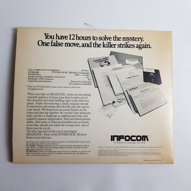 kulcsszavak | Deadline, Infocom, szöveges kalandjáték, floppy lemez, gyűjtői, retro, PC, interaktív, detektív, 1980-as évek |