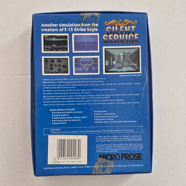 A Silent Service egy második világháborús tengeralattjáró-szimulátor videójáték, amelyet a MicroProse adott ki. A doboz előlapján egy tengeralattjáró képe látható, valamint a játék címe és a platform megjelölése (Spectrum 48/128K). A hátoldalon részletes leírás található a játékról, kiemelve a főbb jellemzőket, például a valósághű szimulációt, a különböző küldetéseket és a taktikai lehetőségeket. A csomagolás kartonból készült, a játék kazettán érkezik. A termék angol nyelvű, és a MicroProse logója is jól látható a dobozon. A játék gyűjtői darab lehet a retro számítógépes játékok kedvelői számára.
