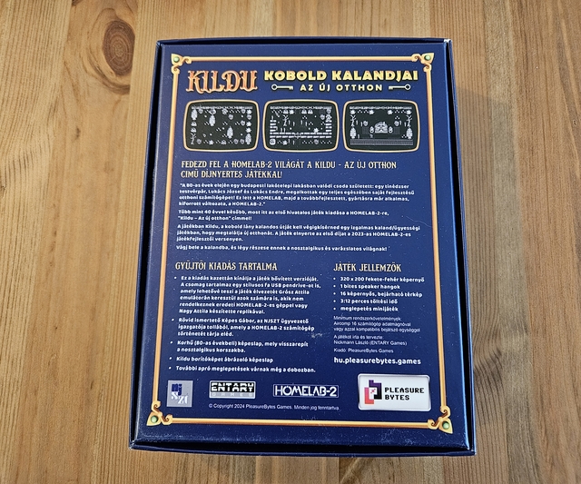 A KILDU – Kobold kalandjai: Az új otthon egy magyar fejlesztésű, gyűjtői kiadású videójáték, amely a Homelab-2 számítógépre készült. A dobozban található egy kazetta, amelyen a játék fut, valamint egy kulcstartó, egy képeslap, egy színes illusztráció és egy részletes leírás. A csomagolás igényes, a doboz elején egy varázslatos, mesebeli ház látható, amely egy fa törzsében helyezkedik el, körülötte gombákkal és egy kobolddal. A hátoldalon részletes információk olvashatók a játékról, a tartalomról és a fejlesztőkről. A termék magyar nyelvű, és kifejezetten gyűjtők számára készült, retro hangulatot idézve.