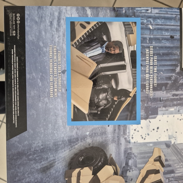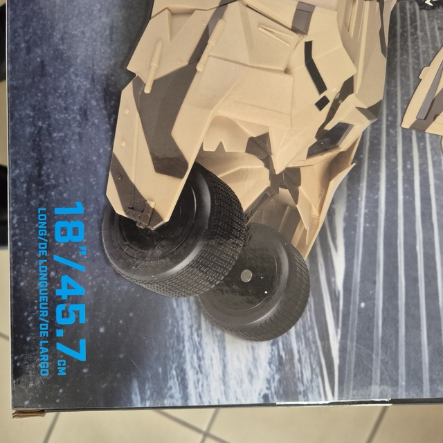 Ez a termék egy Batman franchise-hoz tartozó Camouflage Tumbler jármű, amelyet a Spin Master gyártott. A dobozban található jármű 45,7 cm hosszú, és részletes kidolgozású, katonai álcázó festéssel. A csomagoláson látható, hogy a jármű belsejébe figura is helyezhető, de a figura nem része a csomagnak. A termék műanyagból készült, és gyűjtőknek vagy Batman rajongóknak ajánlott. A doboz angol nyelvű feliratokat tartalmaz, és a termék modern, nem vintage vagy antik darab.