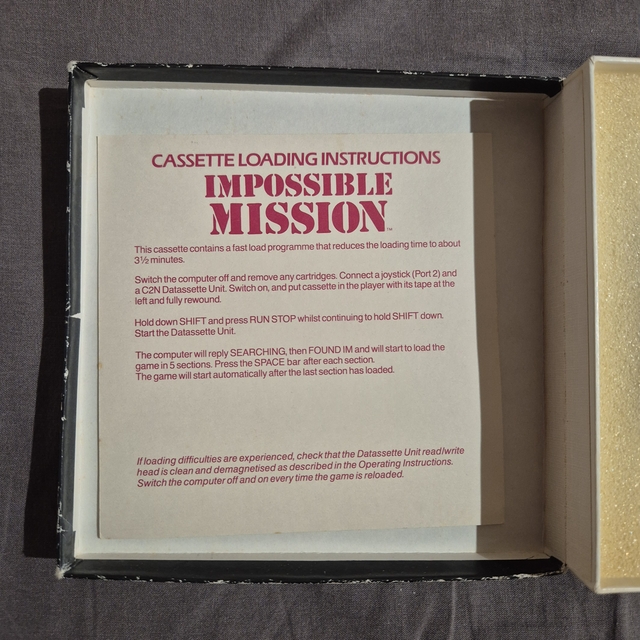 Az Impossible Mission egy klasszikus akciójáték, amely Commodore 64 platformra jelent meg. A képeken a játék eredeti, gyűjtői dobozos változata látható, amely tartalmazza a kazettát, a habszivacs betétet, valamint a betöltési útmutatót is. A doboz borítóján látványos, retro stílusú grafika található, amely a játék feszültségteli hangulatát idézi. A kazetta fekete színű, narancssárga címkével, rajta a játék és a kiadó neve. A leírás angol nyelvű, és részletesen bemutatja a játék célját, valamint a betöltési lépéseket. A termék kiváló állapotban van, igazi ritkaság a Commodore 64 rajongók és gyűjtők számára.