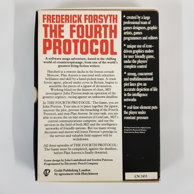 Ez a termék a 'The Fourth Protocol' című videójáték, amely Frederick Forsyth azonos című regényén alapul. A játék Commodore 64 platformra készült, és eredeti kazettás formátumban érhető el. A doboz tartalmazza a kazettát, valamint egy MI5 Investigator's Handbook című kézikönyvet, amely segíti a játékosokat a játék során. A csomagolás fekete-fehér-piros színvilágú, és a borítón hangsúlyosan szerepel a 'Top Secret Software' felirat. A játék egy kémkedéssel és ellenkémkedéssel foglalkozó kaland, amelyben a játékosnak titkos dokumentumokat kell megszereznie és dekódolnia. A termék gyűjtői darabnak számít, mivel eredeti, vintage kiadású, és a 80-as években jelent meg.