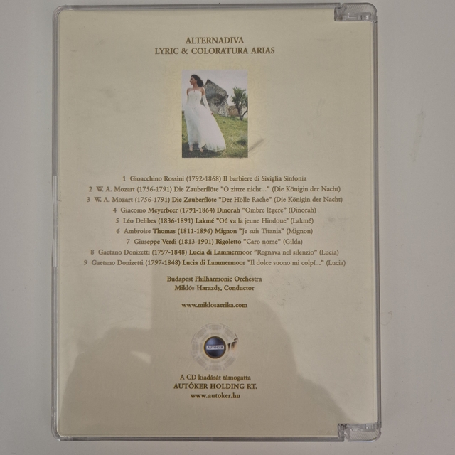 Ez a termék egy Miklósa Erika által előadott zenei CD, amelynek címe AlternaDíva. A borítón Miklósa Erika portréja látható, a hátoldalon pedig a lemezen található művek listája, köztük Rossini, Mozart, Donizetti és más híres zeneszerzők áriái. A CD-t a Budapesti Filharmóniai Zenekar kíséri, a karmester Medveczky Ádám. A tok átlátszó műanyagból készült, a lemez és a betétlap is látható. A termék magyar kiadás, a kiadó az Autóker Holding Rt. A CD klasszikus zenei műfajba tartozik, és főként operaáriákat tartalmaz. A tok mérete szabványos CD tok, kb. 14 cm x 12,5 cm.