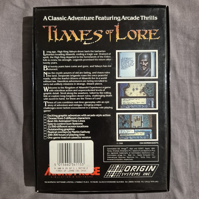 Ez a Times of Lore videójáték dobozos változata Commodore 64/128K platformra, kazettás formátumban. A doboz elején egy fantasy témájú illusztráció látható, amelyen egy páncélos harcos áll egy kapuban, háttérben egy vár és hegyek. A játékot az Origin Systems adta ki, és a dobozon hangsúlyozzák, hogy joystick szükséges a játékhoz. A hátoldalon részletes leírás, képernyőfotók és játékmenet bemutatása található, valamint a vonalkód és kiadói információk is szerepelnek. A doboz kartonból készült, klasszikus retro stílusú, gyűjtők számára is értékes lehet. A termék angol nyelvű.