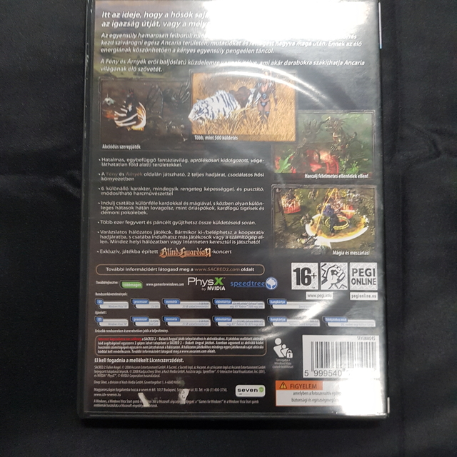 A Sacred 2: Fallen Angel egy akció-szerepjáték, amely PC-re jelent meg. A játék doboza magyar felirattal ellátott, és a borítón a két fő karakter, valamint a játék logója látható. A hátoldalon részletes leírás, képek és rendszerkövetelmények találhatók. A termék 16 éven felülieknek ajánlott, és a DVD formátumú lemez egy műanyag tokban található. A játék a Sacred franchise része, és a dobozon az Ascaron fejlesztő logója is szerepel. A termék kiváló állapotban van, gyűjtők számára is érdekes lehet.