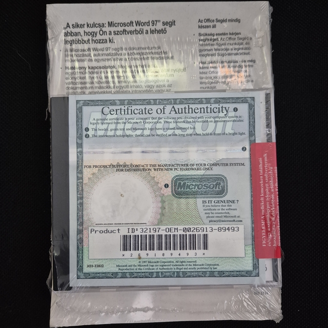 kulcsszavak | Microsoft, Word 97, szoftver, eredetiségi tanúsítvány, PC, irodai program, magyar, CD, bontatlan, gyűjtői |